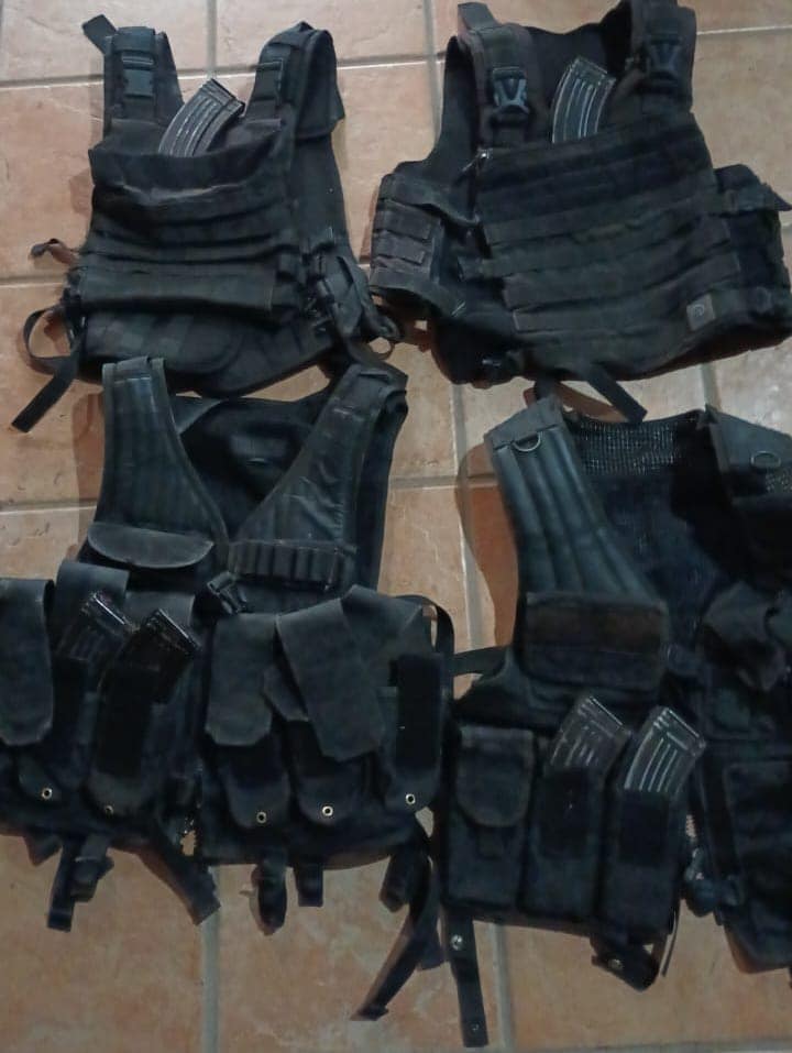 Al realizar una revisión al vehículo, que tenía las puertas abiertas, en su interior localizaron 4 chalecos de color negro, que contenían 6 cargadores para arma calibre 7.62×39 milímetros, de las conocidas como “cuerno de chivo”.