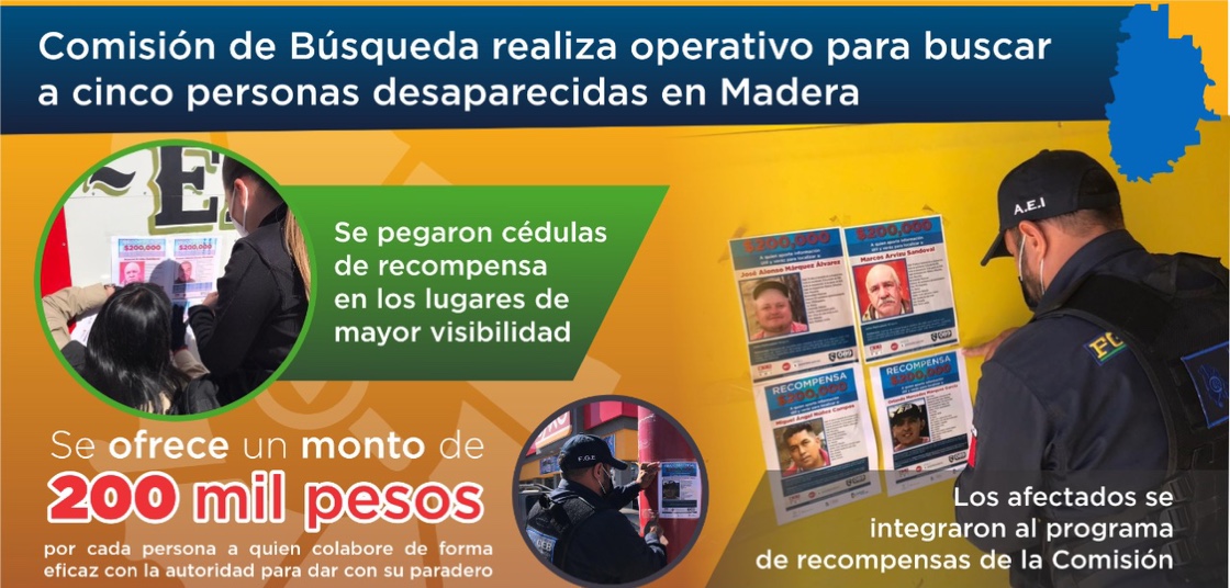 En atención a las solicitudes de intervención presentadas por los propios familiares de las víctimas, el Grupo Especializado de Búsqueda colocó cédulas de recompensa en los lugares con mayor visibilidad.