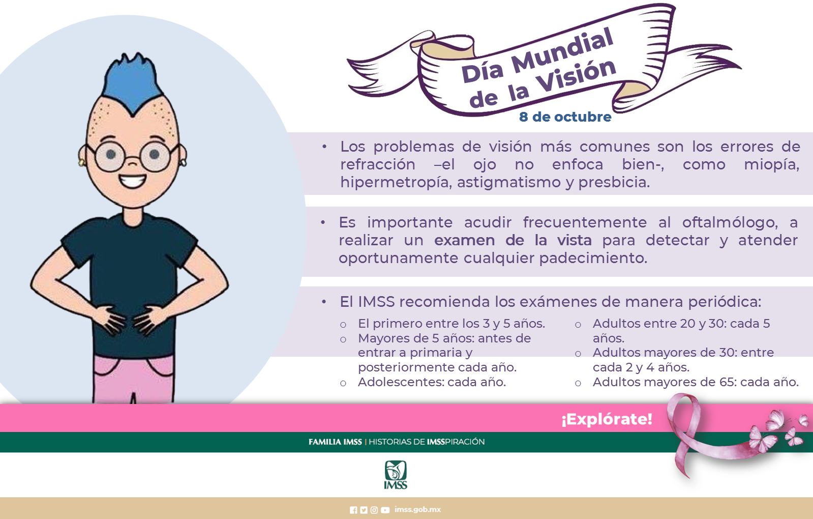 En el marco del Día Mundial de la Visión, a celebrarse este 8 de octubre, la Oficina de Representación Chihuahua del Instituto Mexicano del Seguro Social (IMSS) destaca la importancia de realizar con regularidad el examen de la vista para detectar y atender oportunamente cualquier padecimiento.