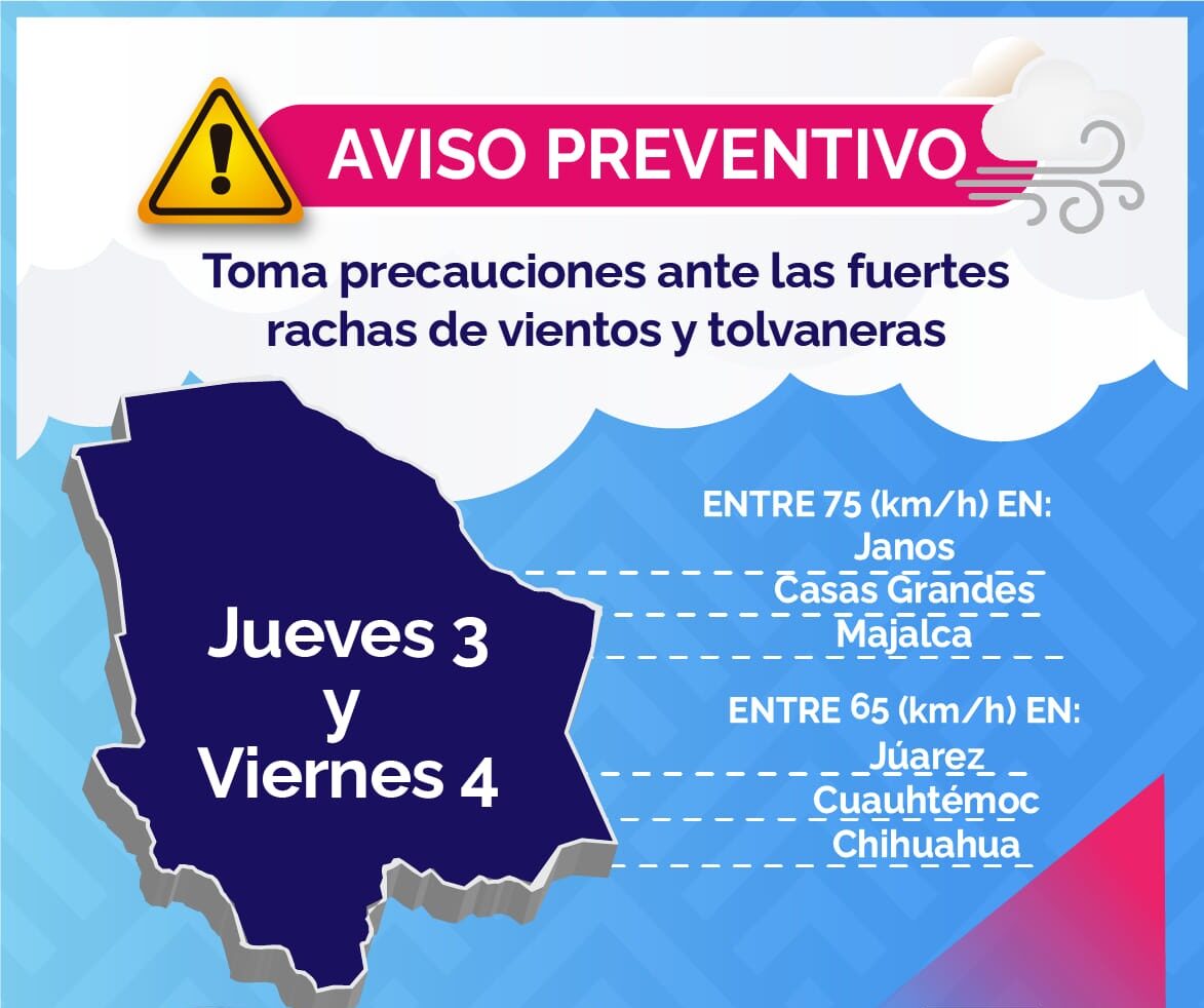 De acuerdo al pronóstico emitido por el Servicio Meteorológico Nacional, la Coordinación Estatal de Protección Civil (CEPC) informa que derivado del frente frío número 7, una vaguada polar y una línea seca se ocasionarán vientos fuertes con tolvaneras y descenso de temperatura sobre municipios del noroeste y norte del estado, para este próximo fin de semana, con incremento de nubosidades y probabilidades de caída de nieve y aguanieve en regiones de Casas Grandes y Cuauhtémoc-Madera.