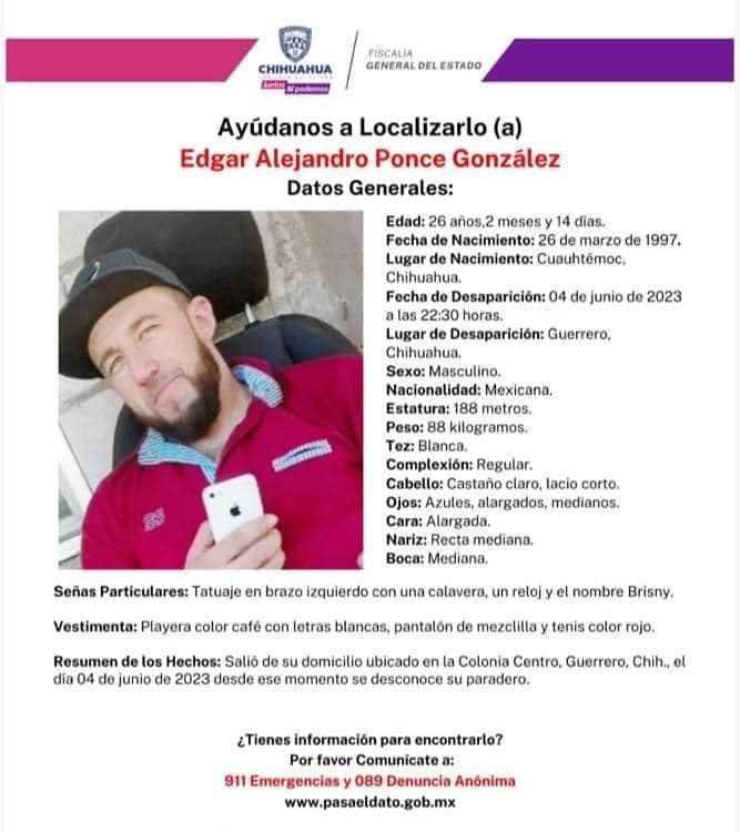 Guerrero, Chih.-La Fiscalía de la zona occidente emitió la pesquisa para tratar de localizar a Edgar Alejandro Ponce González, de 26 años de edad, desaparecido desde el pasado domingo 4 de junio, cuando salió de su domicilio ubicado en la zona centro de la ciudad de Guerrero.