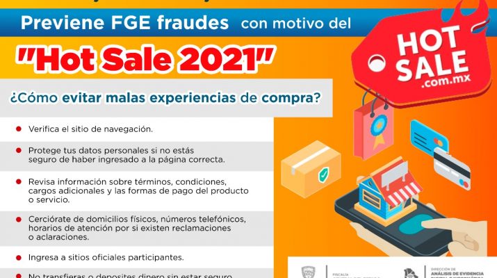 La Fiscalía General del Estado a través de la Dirección de Análisis de Evidencia Digital e Informática Forense emite recomendaciones para evitar ser víctima de fraude durante el Hot Sale 2021, programa que busca motivar la compra online de categorías como viajes, electrónica, ropa, calzado, electrónica, hogar y muebles, alimentos y bebidas, a efectuarse del 23 al 31 de mayo.