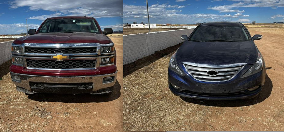 Una pick up de la marca Chevrolet, línea Silverado, color guinda de reciente modelo y un sedán de la marca Hyundai, línea Sonata, modelo 2014, de color azul, ambos con placas de circulación del estado de Chihuahua.
