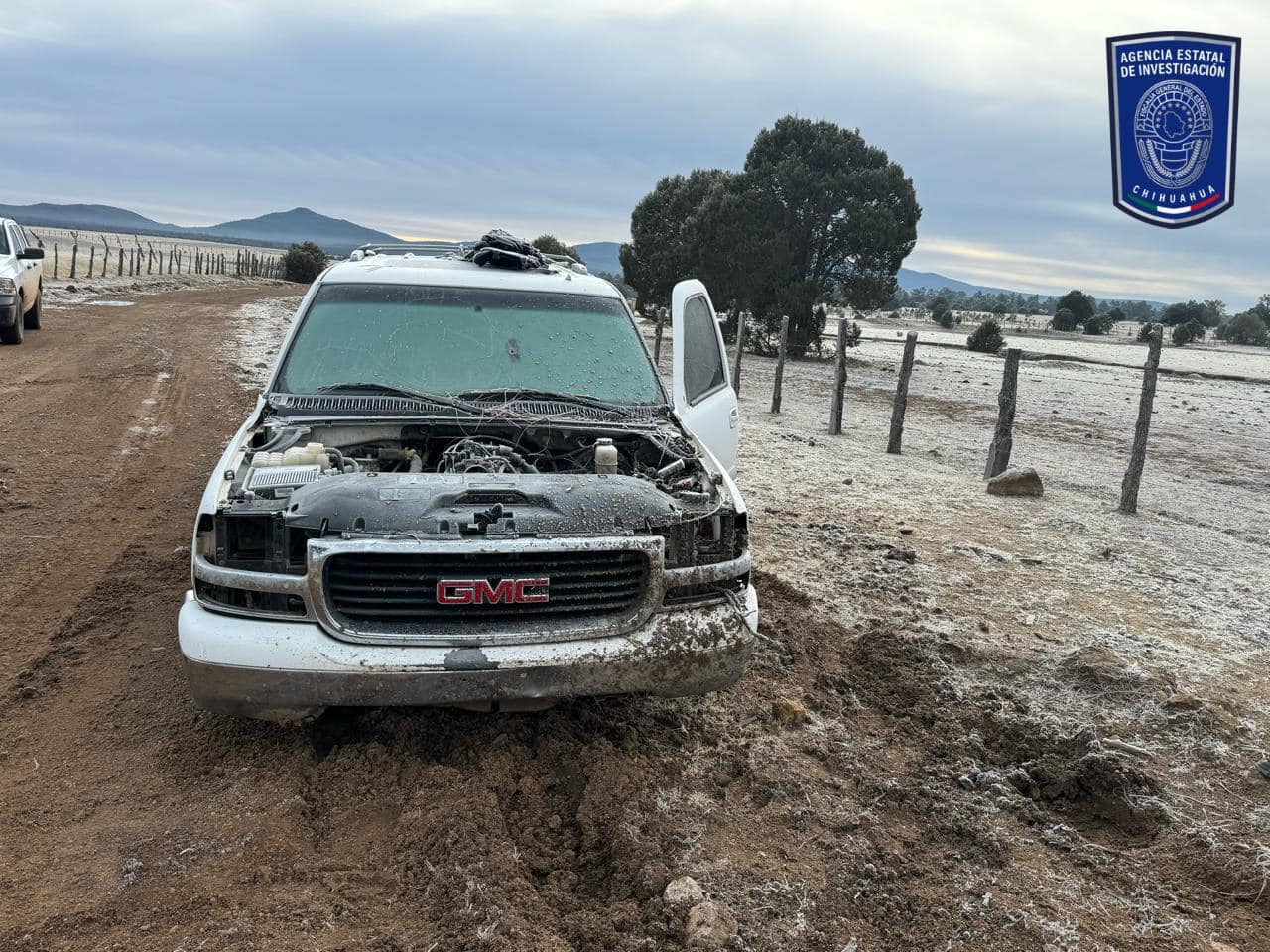 Elementos de la Agencia Estatal de Investigación, adscritos a la Fiscalía de Distrito Zona Occidente, localizaron un vehículo semidesmantelado en una brecha que conduce a la comunidad de Tres Ojitos, municipio de Madera.