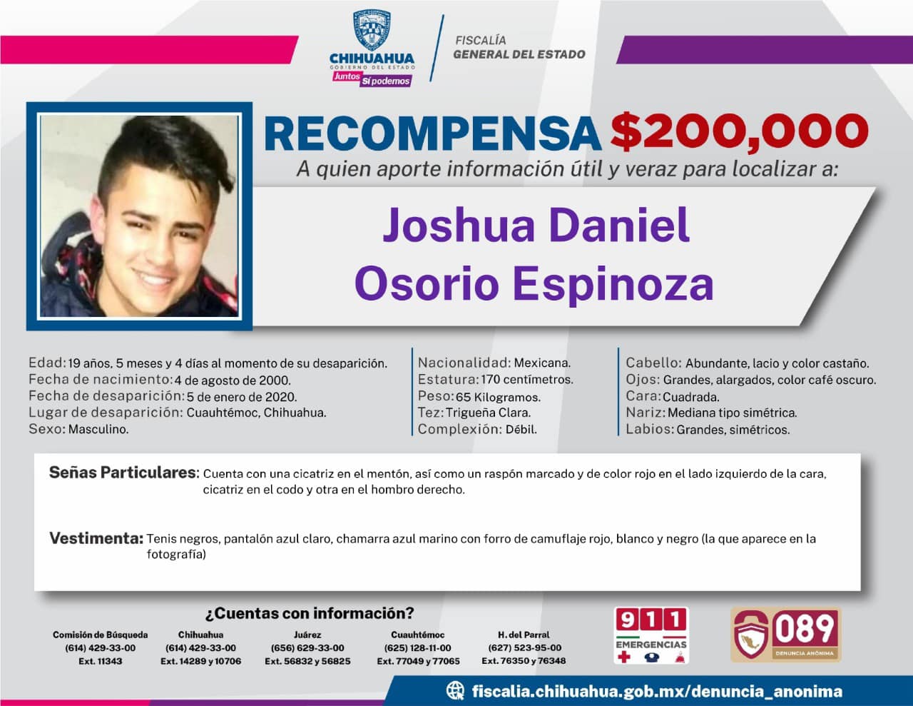 Cuauhtémoc, Chih.- Mantiene Fiscalía la pesquisa para tratar de dar con el paradero del joven Joshua Daniel Osorio Espinoza. Se cumplen dos años su desaparición.