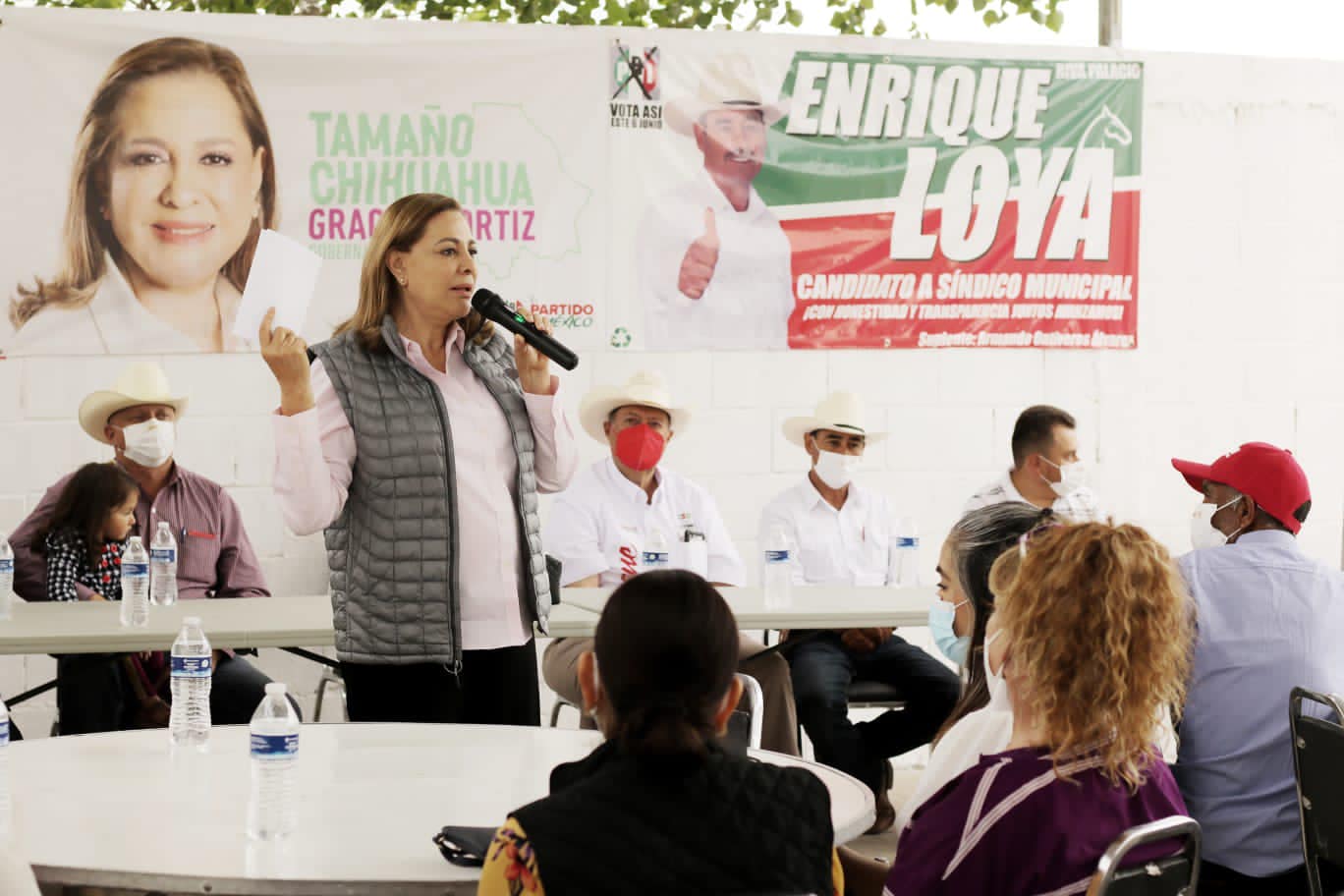 Acompañada por los candidatos a presidente Municipal, Jorge Adrián “el güero” Aguilar; a Síndico, Enrique Loya Marrufo y a diputado local por el Distrito XIV, Rafael “el Cheque” Martínez Pérez, la aspirante a la gubernatura habló de la importancia de que el priismo se encuentre unido en torno al único objetivo de poner a Chihuahua nuevamente de “pie” y salir del “abandono en el que se encuentra”.