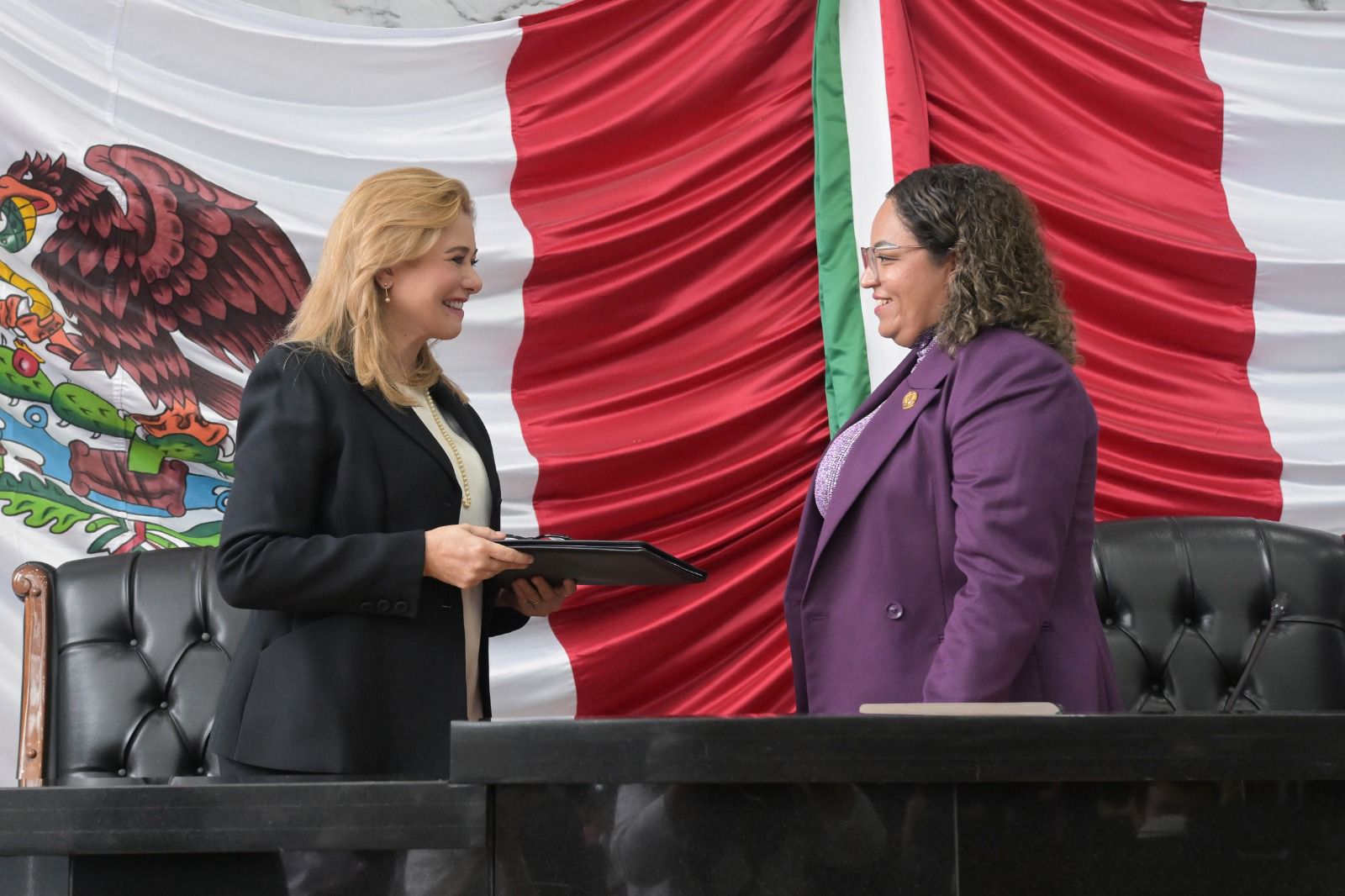 Durante el acto, la titular del Ejecutivo presenció la toma de protesta a las y los 33 nuevos legisladores, a quienes saludó y reconoció su disposición de llevar ante el Pleno, las propuestas que realmente sirvan a la población.