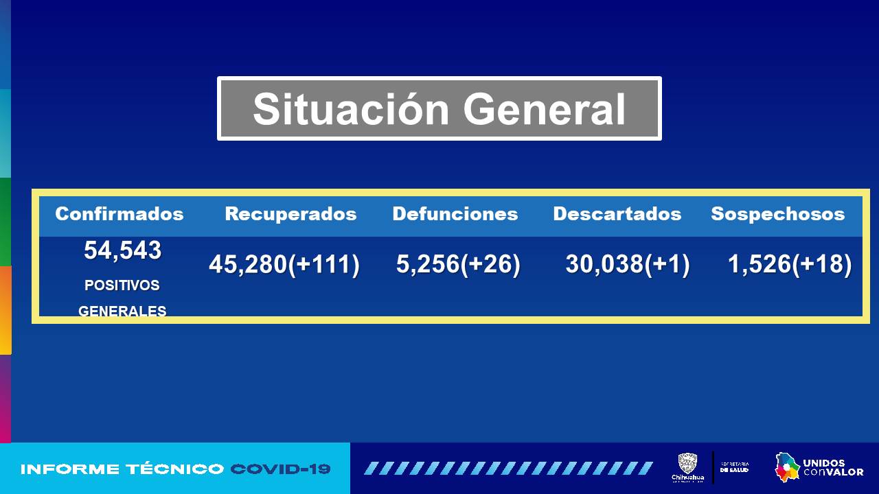 De acuerdo a la tabla de Casos Recuperados por Municipio de Residencia, Juárez se encuentra a la cabeza con 25 mil 078 personas, seguido de Chihuahua con 11 mil 105, Parral con mil 592, Delicias con mil 559, Cuauhtémoc mil 410 y Ojinaga con mil 039 casos.