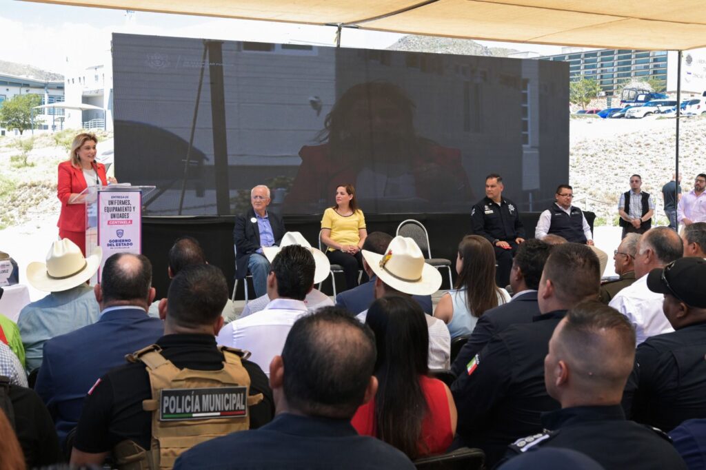 La gobernadora Maru Campos encabezó la ceremonia de entrega de uniformes, equipamiento y unidades policiacas, a corporaciones de seguridad pública de 49 municipios, con una inversión superior a los 26 millones de pesos.