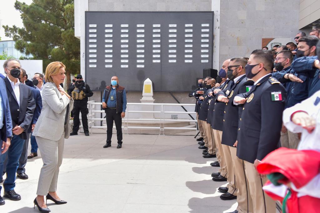 La gobernadora, Maru Campos Galván y el Fiscal General del Estado, Roberto Fierro Duarte, encabezaron este martes en Ciudad Juárez un homenaje póstumo al comandante Alejandro Domínguez Cabriales, el oficial Gil Malo Solano y el comandante Ezequiel Emanuel Ortiz Fierro, quienes murieron en cumplimiento de su deber y desempeñaron hasta el último momento su juramento de servir con lealtad a la ciudadanía.