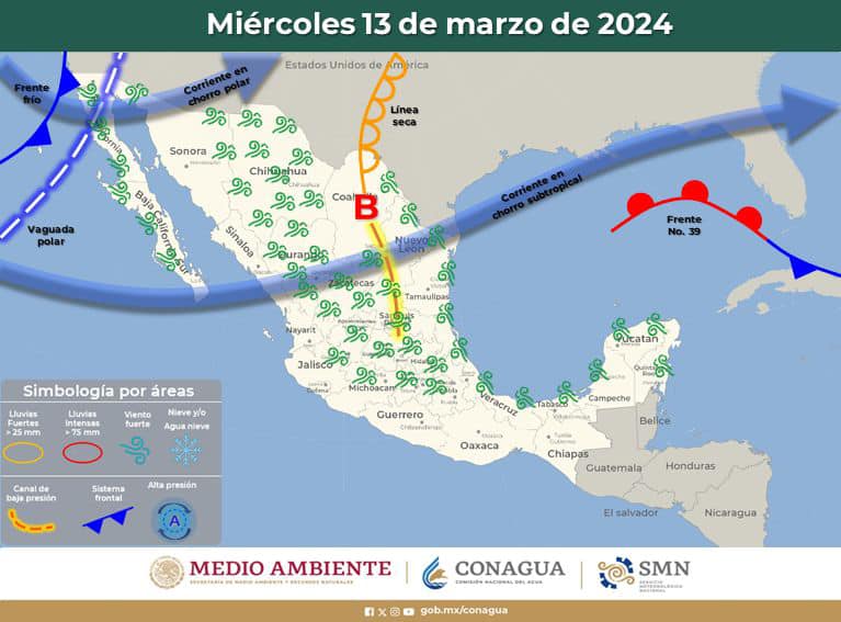 Además, la aproximación del frente frío número 40 al noroeste del país, en interacción con una vaguada polar, la corriente en chorro, un canal de baja presión y una línea seca, generará un aumento de la velocidad en los vientos.