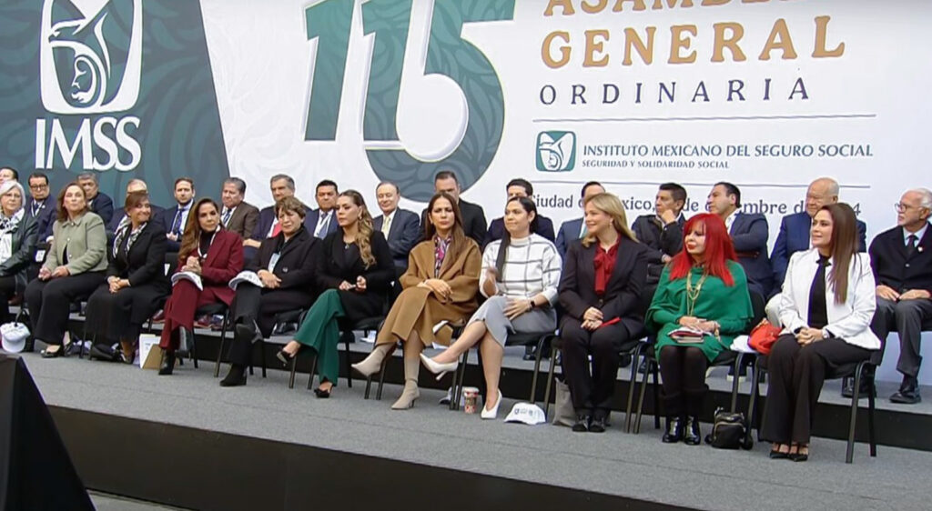 La gobernadora Maru Campos acudió como invitada especial a la 115 Asamblea General Ordinaria del Instituto Mexicano del Seguro Social (IMSS), celebrada en el Patio Central de Palacio Nacional, en la Ciudad de México.