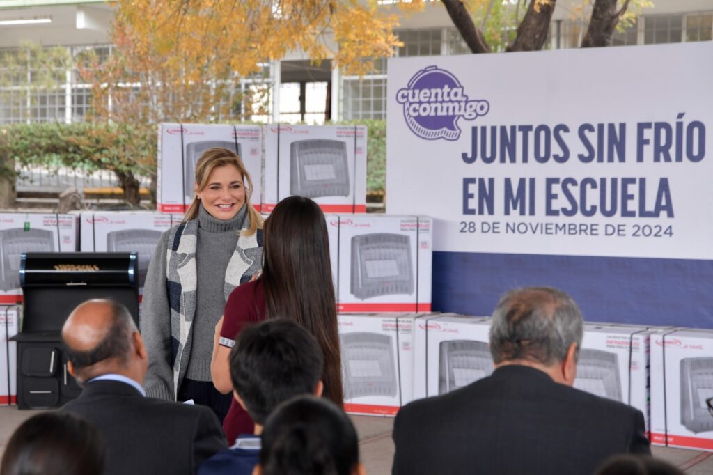 La gobernadora Maru Campos entregó a alumnas y alumnos de la Escuela Secundaria Federal No. 1 “Profr. Guillermo Prado Prado, calefactores e insumos como parte de inicio de la campaña “Juntos sin Frío en mi Escuela”, en beneficio de 621 estudiantes del plantel.