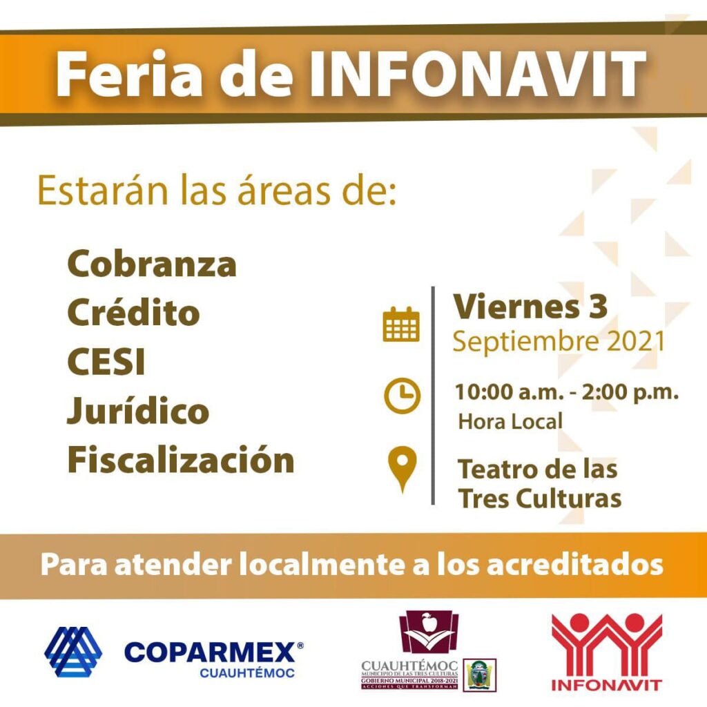 Gracias a la participación conjunta entre COPARMEX y el Municipio de Cuauhtémoc, se desarrollará el próximo viernes 3 de septiembre “La Feria de INFONAVIT”, la cual tiene como visión el acercamiento de los patrones, derechohabientes y acreditados al instituto, con el fin de brindarles asesoramiento a todo aquel que esté interesado o cuenta con algún crédito Infonavit.