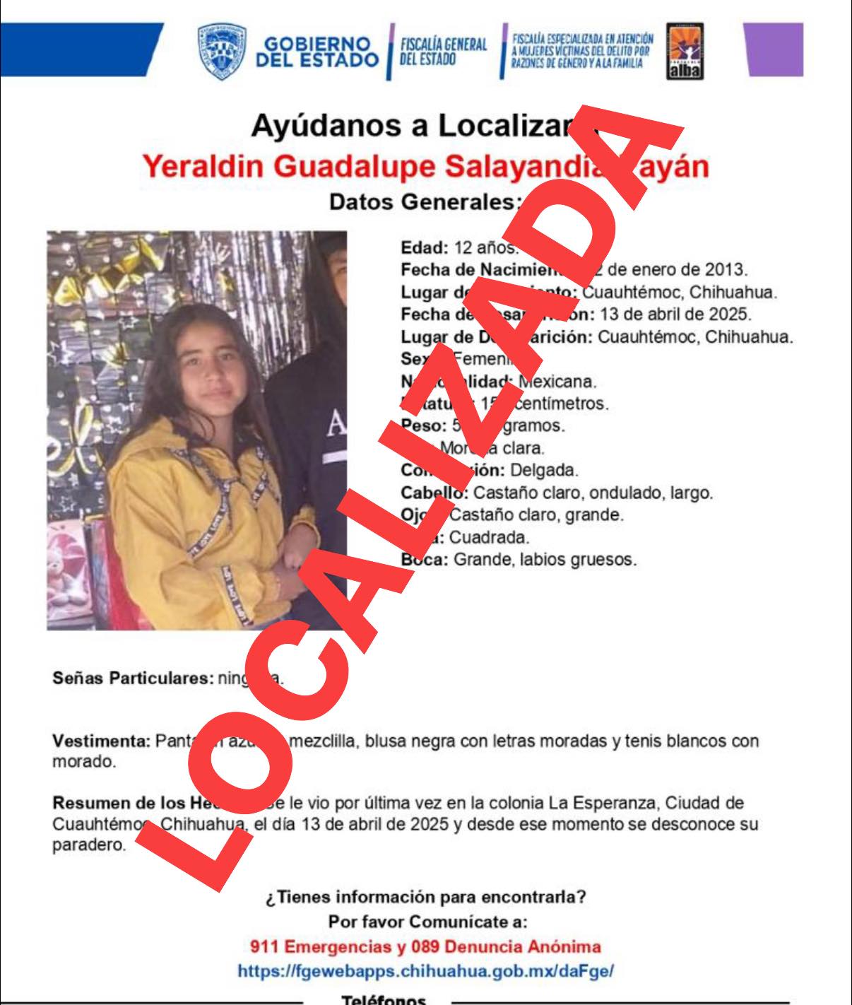 Los elementos de la Agencia Estatal de Investigación adscritos a la Unidad de Investigación de Niñas, Adolescentes y Mujeres Ausentes, encontraron a la menor de 12 años de edad, en la colonia Ex Agrícola San Antonio, en la ciudad de Cuauhtémoc.
