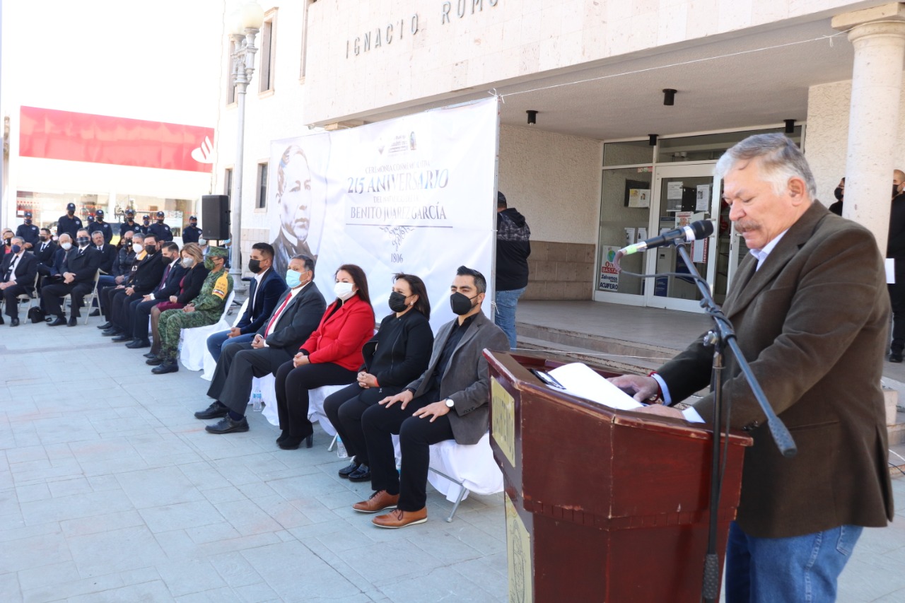 Cuauhtémoc, Chih.-Con honores e izamiento a toda asta de la bandera, autoridades civiles y militares, así como miembros de las logias masónicas, conmemoraron el 215 aniversario del natalicio del ex presidente, estadista y reformador de Derechos Humanos, Benito Pablo Juárez García.