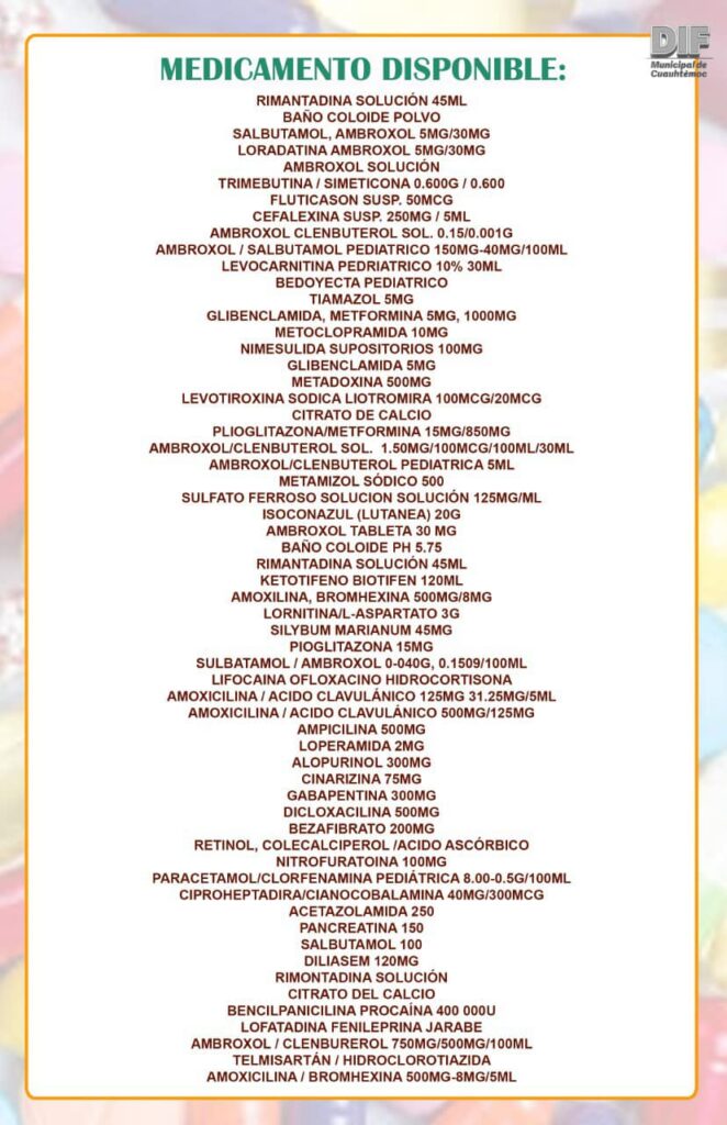 A continuación se anexa un listado de medicamento disponible en el DIF Municipal.