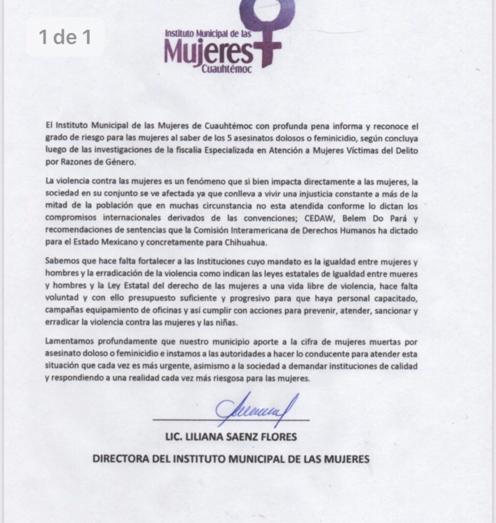 El Instituto Municipal de las Mujeres de Cuauhtémoc con profunda pena informa y reconoce el grado de riesgo para las mujeres al saber de los 5 asesinatos dolosos o feminicidio, según concluya luego de las investigaciones de la fiscalía Especializada en Atención a Mujeres Víctimas del Delito por Razones de Género.