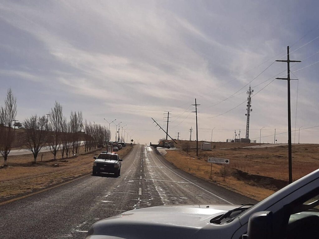 Asimismo se informa sobre el cierre parcial de la circulación en la carretera Cuauhtémoc – Anáhuac, ya que se está evaluando conjuntamente con personal de CFE el posible colapso de postes que sostienen la red eléctrica.