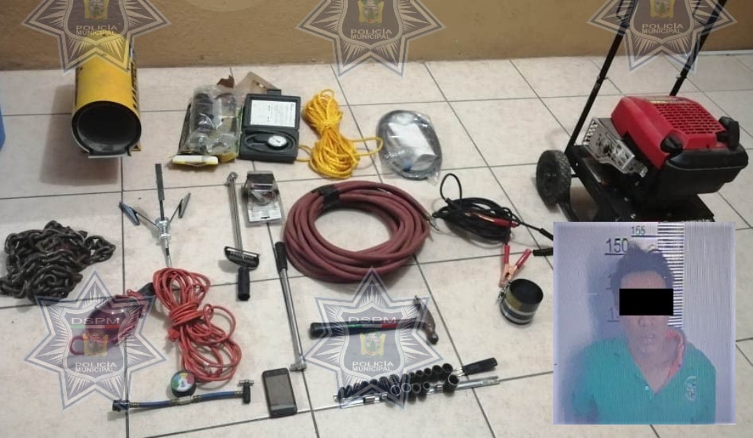 En el lugar además de la detención de dicho individuo fue posible la recuperación de los siguientes artículos: un generador de luz marca Coleman de 2500 wats, un calentador de propano marca Máster de 30,000 BTU, una cadena de aproximadamente 2.5 metros con gancho, una extensión con foco color naranja, un cepillo para anillos automotrices, tres mangueras, una engrasadora marca John Deer, un medidor de presión de gas color negro, una manera de fuerza de 1/2 marca American Forge, un opresor de anillos para pistón automotriz, cables pasa corriente, un medidor de presión de aceite automotriz, soga trenzada en color amarillo, dos juegos de dados de impacto marca American Forge, un martillo metálico color rojo y negro marca Ridgid, un teléfono celular marca Alcatel en color rosa con negro y un manómetro para gas refrigerante automotriz.