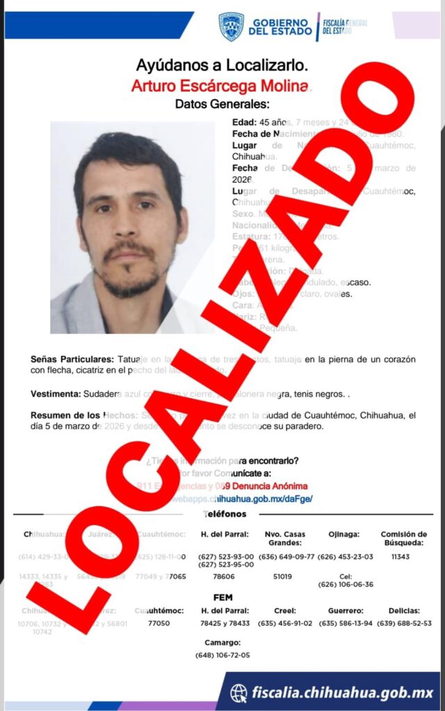 Mientras que el masculino de nombre Arturo E. M., de 45 años de edad, quien contaba con reporte de ausencia interpuesto el 05 de marzo del 2026, fue localizado en la ciudad de Cuauhtémoc.