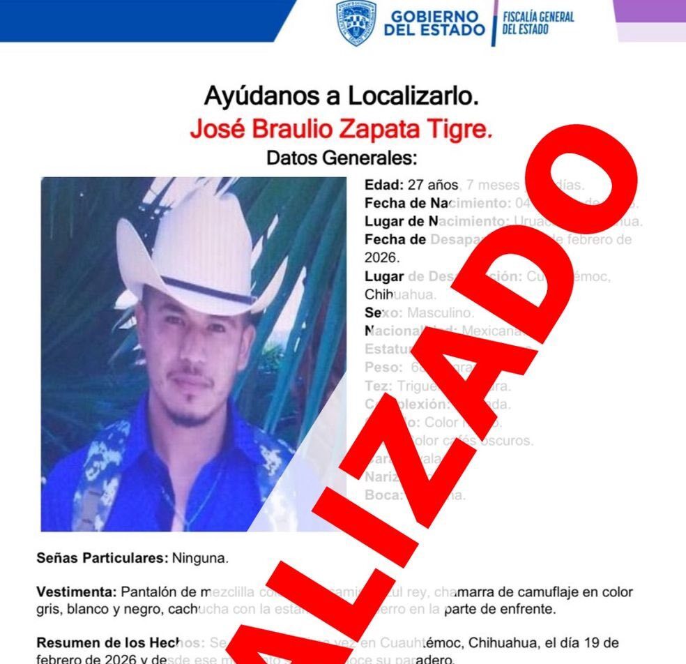 Uno de ellos, es la persona de nombre José Braulio Z. T., cuya ausencia fue reportada el 19 de febrero 2026, fue localizado en el municipio de Uruachi, con sus familiares.
