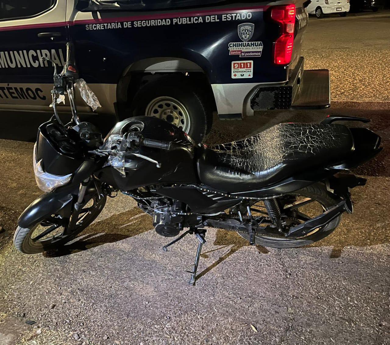 La unidad, de color negro y sin placas de circulación, se encontraba aparentemente abandonada sobre la cinta asfáltica. Al realizar la verificación correspondiente, se confirmó que se trataba de una motocicleta marca Italika, línea 125 cc, modelo 2021, la cual contaba con reporte de robo sin violencia registrado en un domicilio del fraccionamiento Los Olivos, en la ciudad de Cuauhtémoc, con fecha 31 de diciembre de 2025.