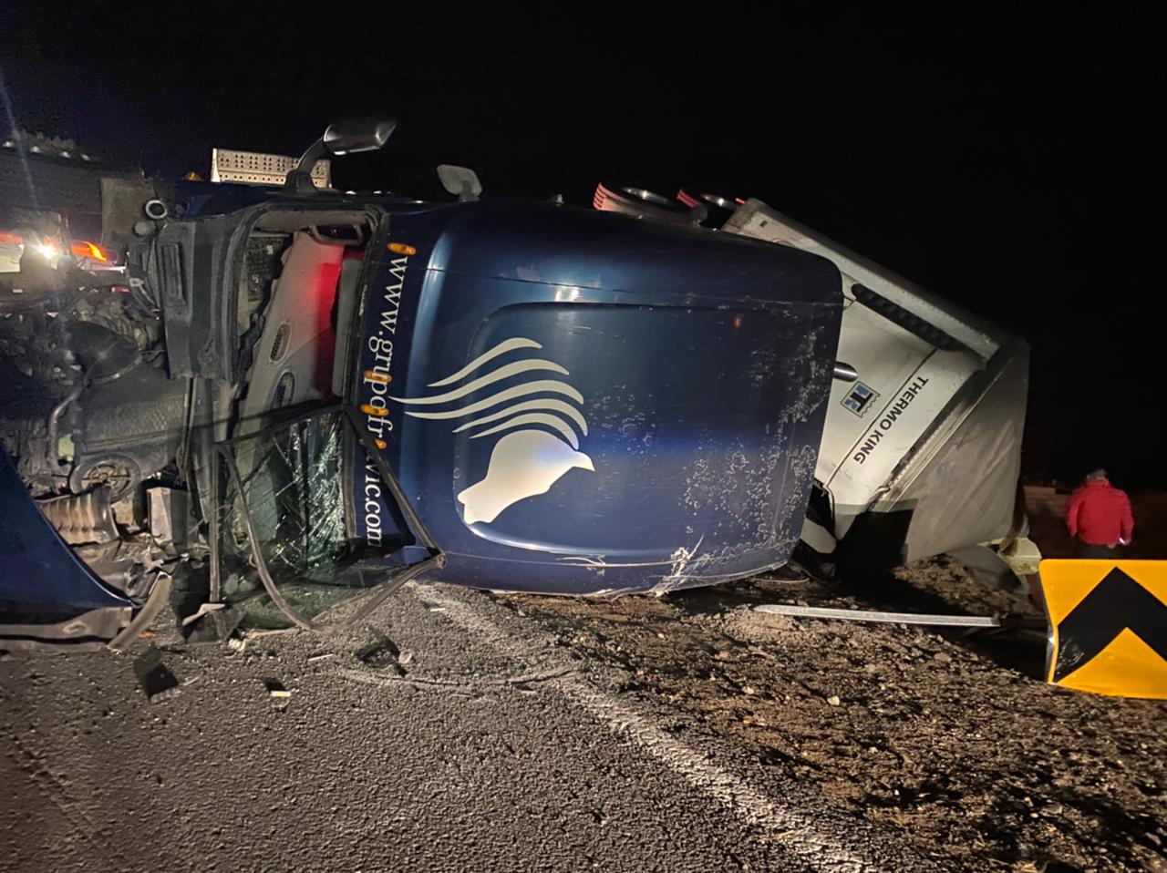 En el lugar, propiamente en una curva que conecta el libramiento Gómez Morín con dicha rúa se localizó un vehículo de carga volcado con tracto camión marca Freightliner y remolque tipo caja refrigerada.
