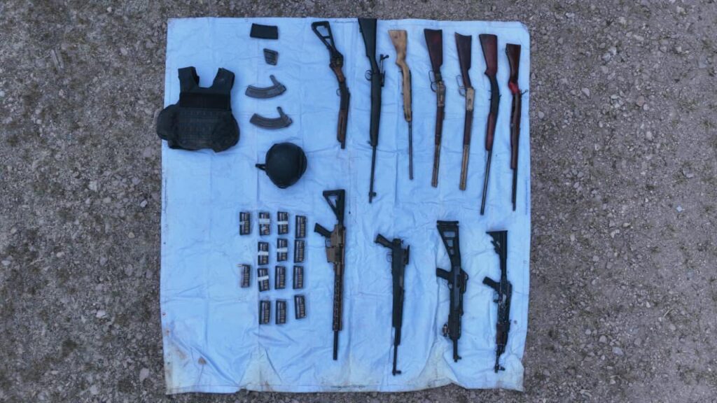 En el mismo operativo, se logró el aseguramiento de 11 armas largas de distintos calibres, así como cargadores, cartuchos útiles y diverso equipo táctico, entre ellos un chaleco portaplacas y un casco balístico.